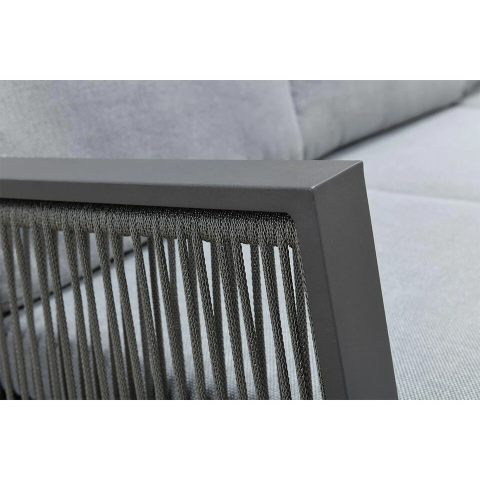 Deze lounge dining set is vervaardigd uit aluminium samen met rope. Rope is de nieuwste trend op het gebied van tuinmeubelen. Deze complete lounge dining set is vervaardigd uit een weerbestendig en onderhoudsvrij frame van aluminium. Het frame is voorzien van een stevige donker grijze poedercoating. Dit frame heeft een mooie afwerking van textileen touw, dit touw heeft een diameter van 8 mm en een donker grijze kleur.