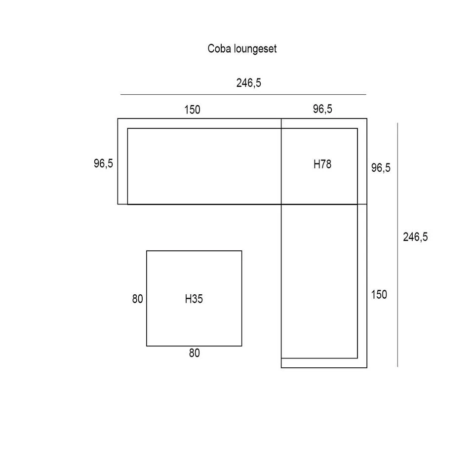 De set heeft een afmeting van 246 x 246 x 78 cm en de loungetafel heeft een afmeting van 80 x 80 x 36 cm.