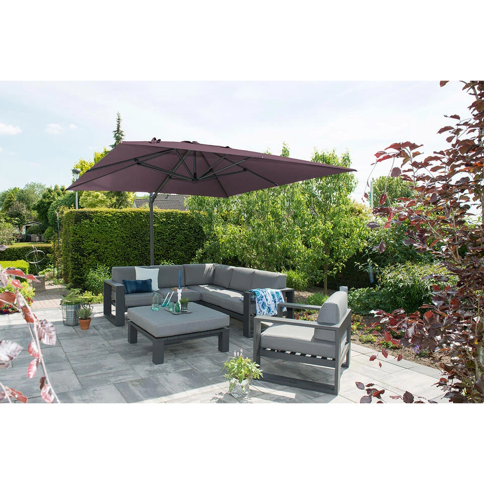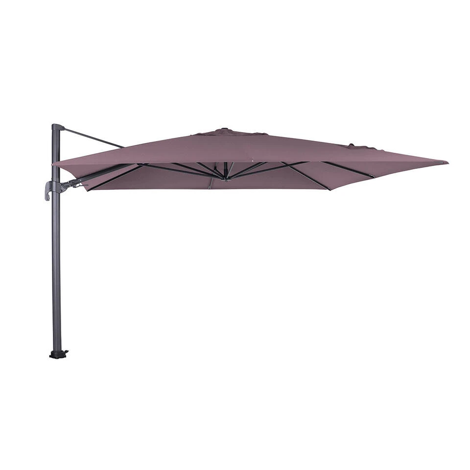 De parasol beschikt over een 280 grams polyester doek wat zorgt voor bescherming tegen de zon. Verkleuring van het koper kleurige doek door de zon is na verloop van tijd niet tegen te gaan. Bovendien is het doek voorzien van een brandwerende PA-coating en een windvanger, zodat de wind goed weg kan als deze onder de parasol komt. Het doek is spatwaterdicht en heeft een afmeting van 350×350. Het stevige dikke aluminium frame is voorzien van een hoogwaardige kwaliteit donker grijze poeder coating.
