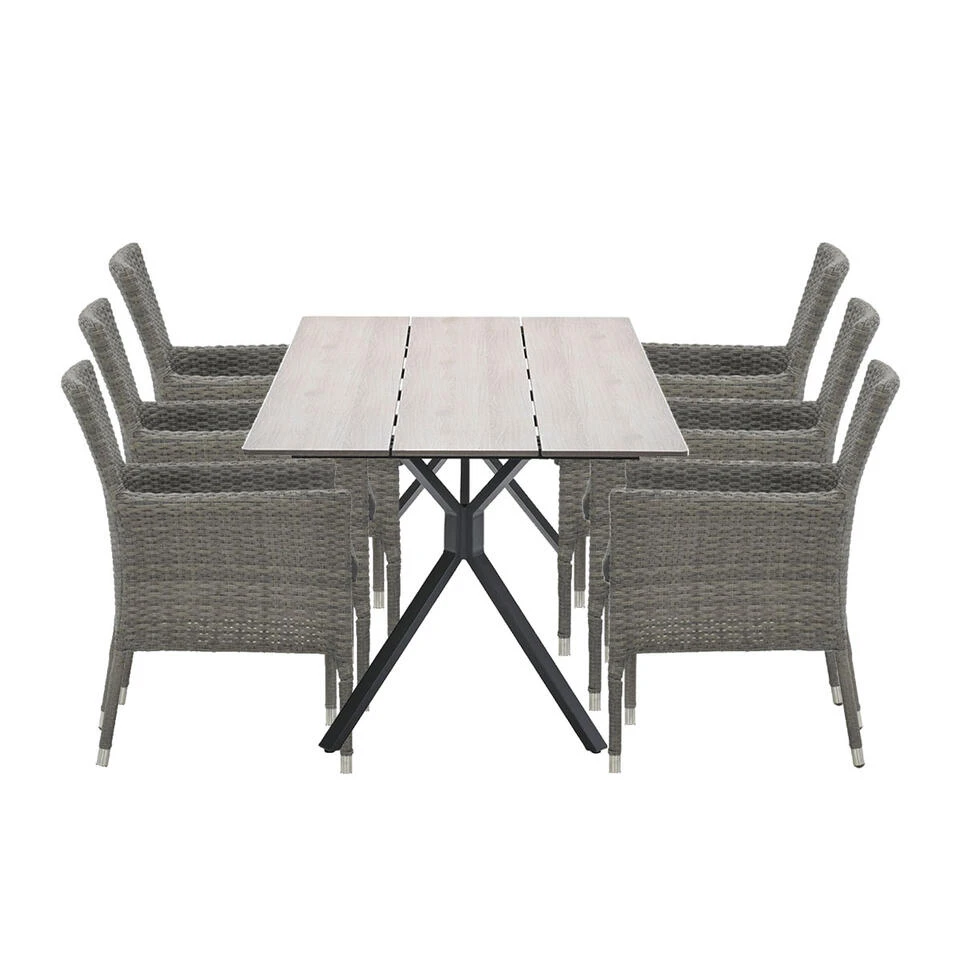 De Jerba – Robin 7-delige tuinset heeft een ruime tuintafel met zes tuinstoelen. De tuinstoelen hebben zijn stapelbaar en daarom eenvoudig op te bergen. De tuintafel heeft prachtige brede planken als tafelblad en kruispotig onderstel. De tuinstoelen worden inclusief zitkussen geleverd.