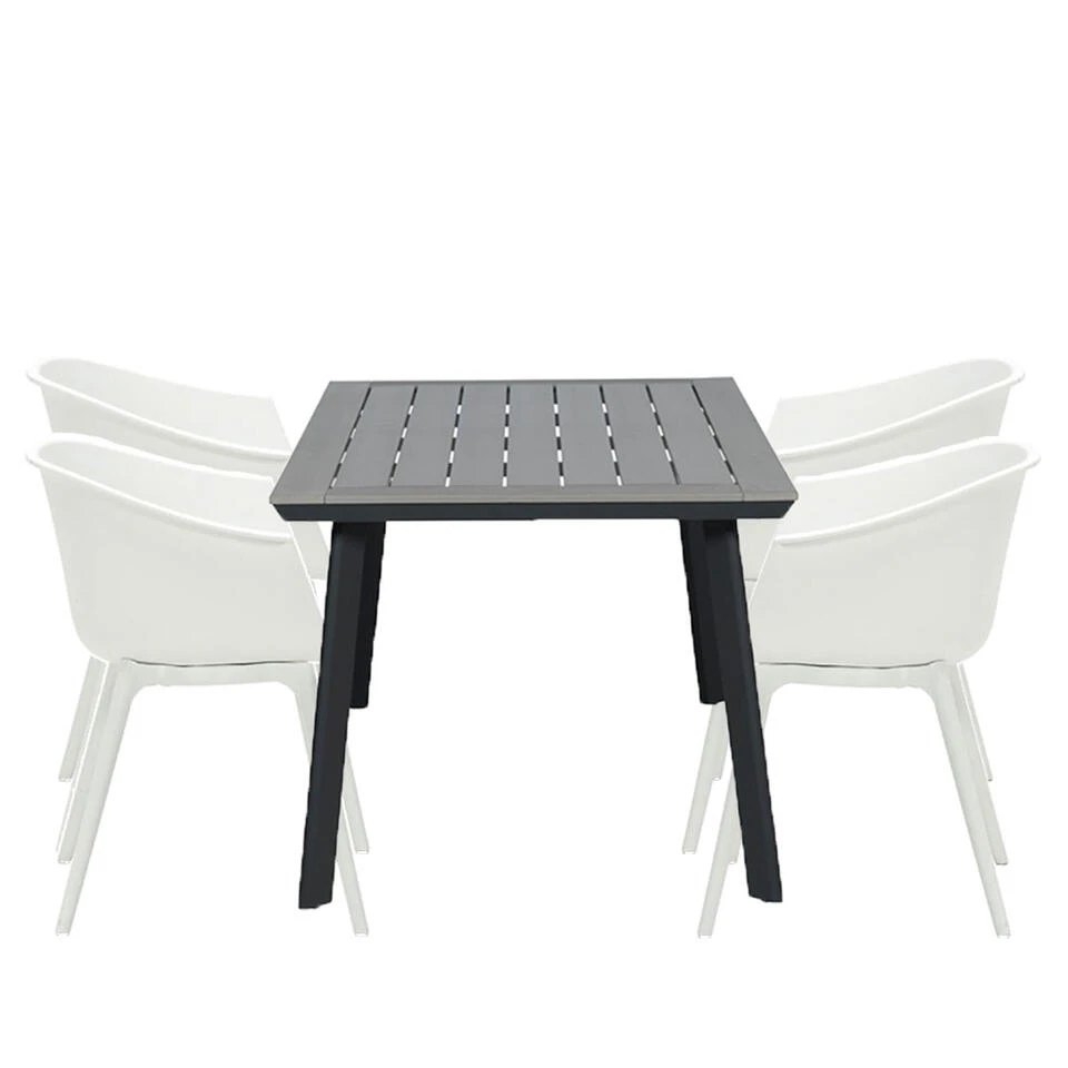 De stoelen zijn gemaakt van onderhoudsvrij kunststof dat erg stevig is. De stoel is zowel voor binnen als buiten uiterst geschikt. De Penedo tuintafel heeft een aluminium frame in de kleur carbon black met een stevige poeder coating laag. Het frame is fraai vormgegeven door de ronde tafelpoten die schuin onder de tuintafel zijn geplaatst.