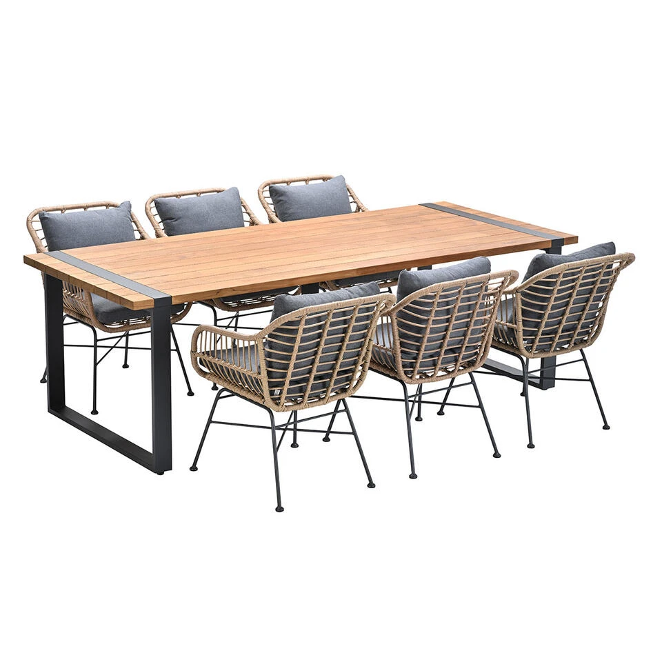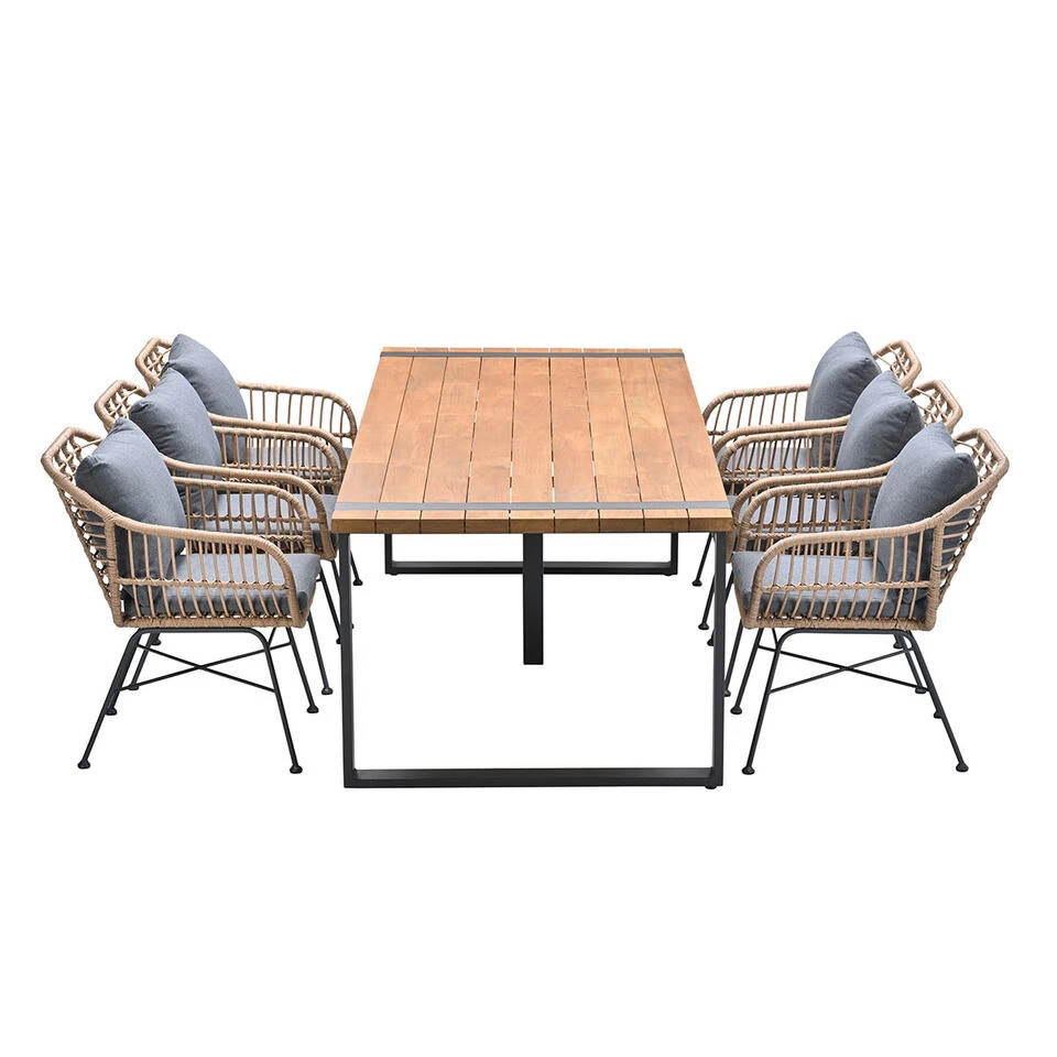 De tuinstoel heeft een frame van aluminium en het onderstel is gemaakt van staal. Om het aluminium zit bruin vlechtwerk met de hand gevlochten. De buiten stoel dient nog gemonteerd te worden bij levering. De poten kunnen op een gemakkelijke wijze vast worden gemaakt. De tuinstoel wordt geleverd inclusief een grijskleurig zitkussen. Het kussen is voorzien van een rits, waardoor de hoes gemakkelijk met de hand gewassen kan worden. De Alto tuintafel heeft een tafelblad gemaakt van teakhout. Het onderstel van deze prachtige tuintafel is gemaakt van aluminium. Teakhout is van nature een vettige houtsoort en hierdoor zeer duurzaam en uitstekend geschikt voor buiten. Zonder behandeling zal teakhout in de buitenlucht ruwer aan de oppervlakte worden en kunnen er op den duur haarscheurtjes ontstaan. Dit alles doet geen afbreuk aan de kwaliteit van de tuintafel, het geeft de tuintafel wel een natuurlijke uitstraling. In de buitenlucht zal het hout vergrijzen.