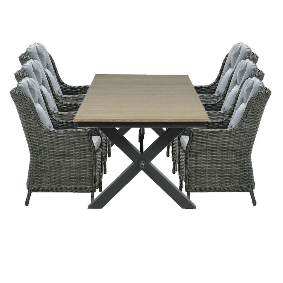 De tuinstoel heeft een afmeting van 62 bij 73 en is 96,5 cm hoog. De tuintafel is 240 bij 100 cm en is 76 cm hoog. De tuinset bestaat uit zes stoelen en 1 tuintafel.