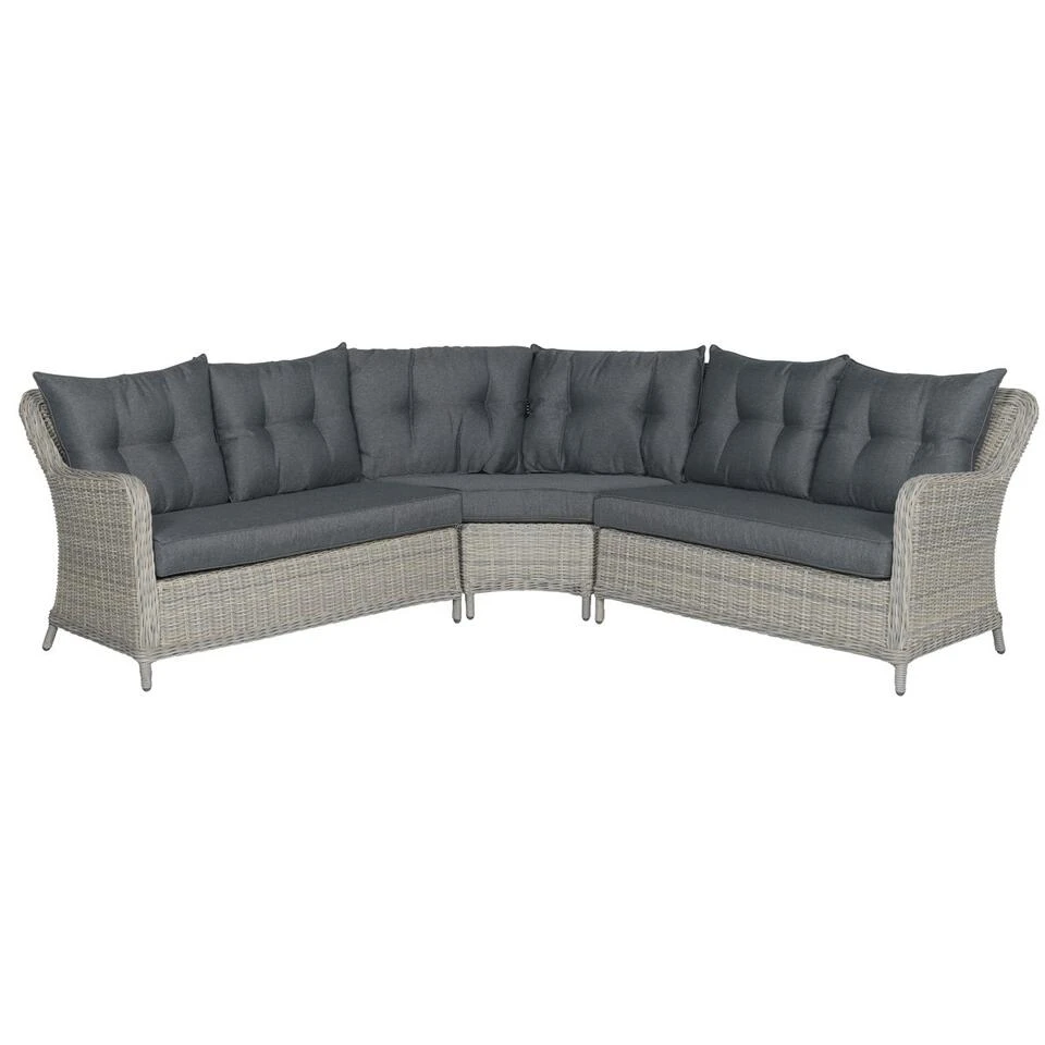 De afmeting van de lounge dining set is 237x237xH85 cm met vintage willow kleurig wicker vlechtwerk. De kussens worden geleverd in de kleur reflex black.