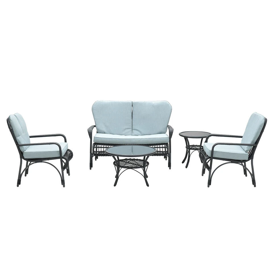 De loungeset wordt geleverd met een mooie loungetafel. Deze tafel is hetzelfde vormgegeven als de set en voorzien van een glazen tafelblad. Dit is gehard glas en gaat niet zomaar kapot. Daarnaast beschikt deze set over waterafstotende dikke loungekussens. Deze zorgen voor een heerlijke comfortabele zit.