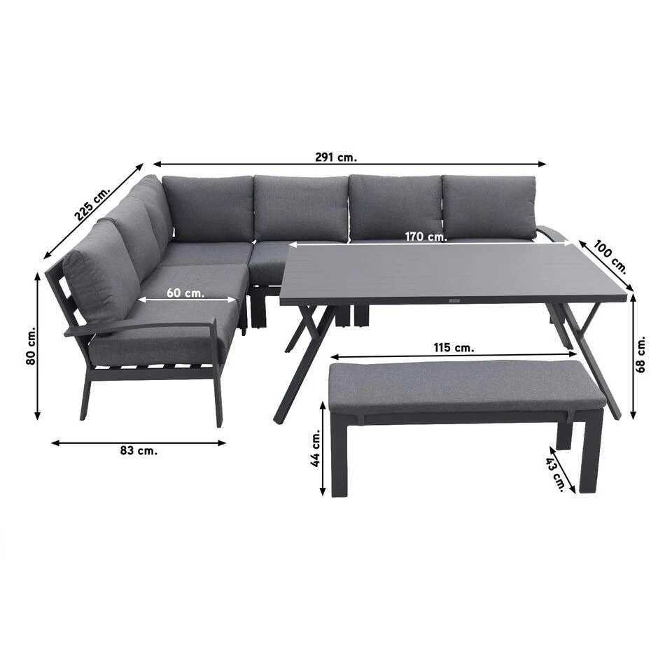 De Rondo lounge diningset is van het bekende tuinmeubelmerk Garden Impressions. Dit merk staat voor uitstekende kwaliteit. Het frame van de Rondo lounge dining set is gemaakt van hoogwaardig aluminium welke afgewerkt is met een beschermende poedercoating. Aluminium wordt veel gebruikt in de tuinmeubelindustrie en heeft dan ook vele voordelen. Zo is dit materiaal licht in gewicht, kan het niet verroesten en is het weerbestendig. De lounge diningtafel is net als het frame volledig vervaardigd uit hoogwaardig aluminium. Dankzij de schuine tafelpoten kun je gemakkelijk met je benen onder de tafel zitten. Zelfs hier is over nagedacht!