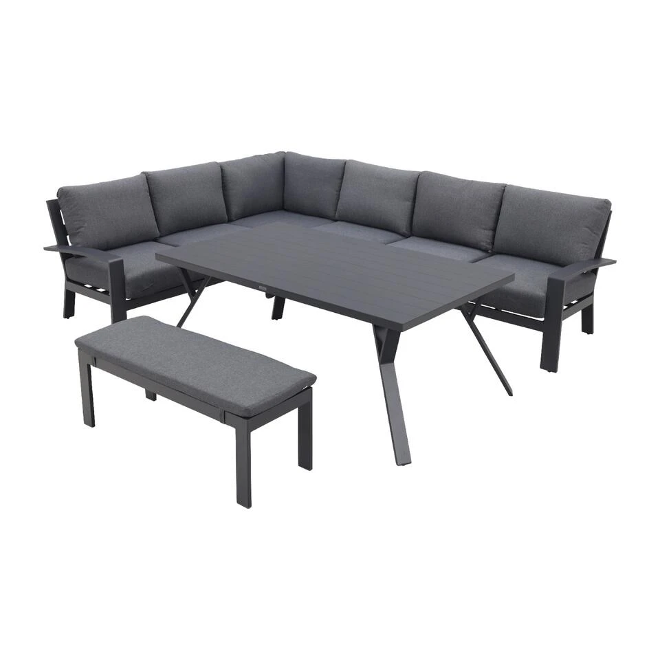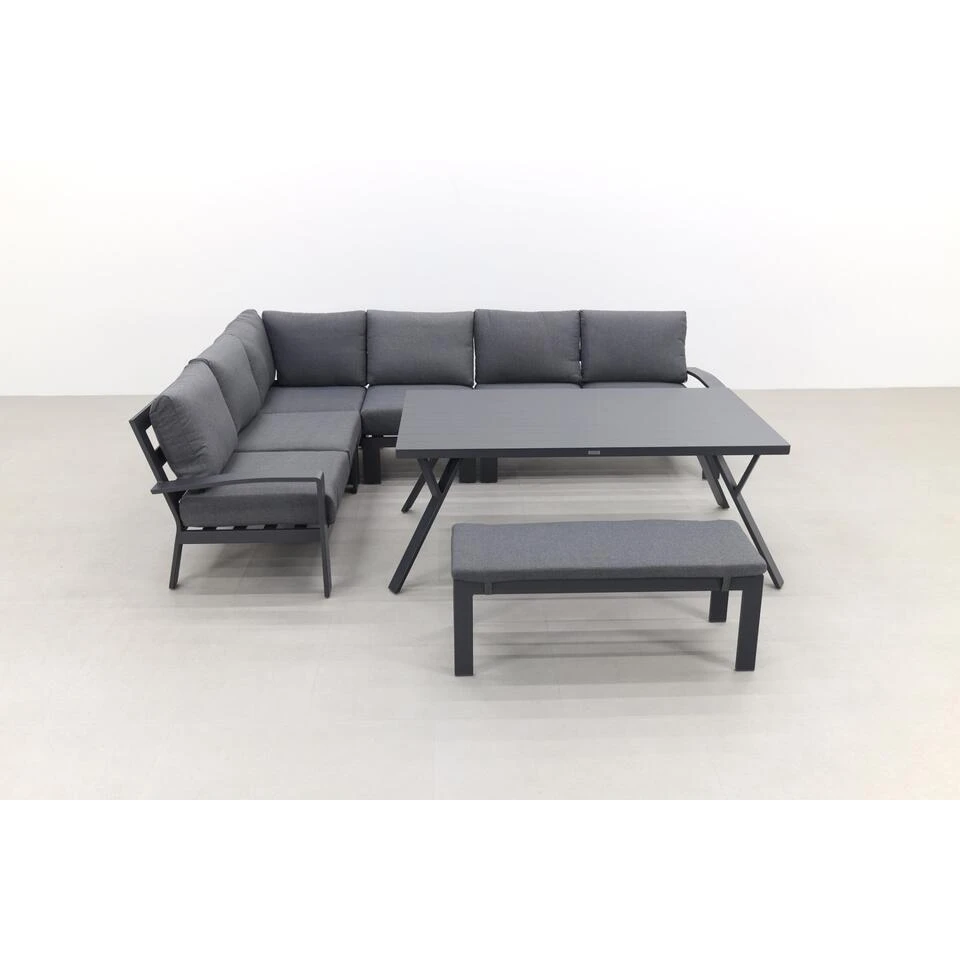 Ben jij op zoek naar een comfortabele lounge- diningset? De Rondo lounge dining is een 6-delig set welke uitgevoerd is met mystic grijze zit- en rugkussens. Deze kleur combineert fantastisch bij het carbon black frame. Het frame is mooi rond afgewerkt en geeft de Rondo lounge diningset dan ook een chique uitstraling. Met zijn ruime opstelling zorgt de Garden Impressions Rondo ervoor dat je met een grote groep kunt dineren, namelijk tot wel 9 personen. De Rondo dinner loungeset bestaat uit een linkse open bank, rechtse open bank, midden element, hoek element, ruime tafel en een bijzetbankje. Dankzij het midden element heb je ook de mogelijkheid om van de lounge- diningset een linkse opstelling te maken. Net wat jou beter uitkomt op je terras.