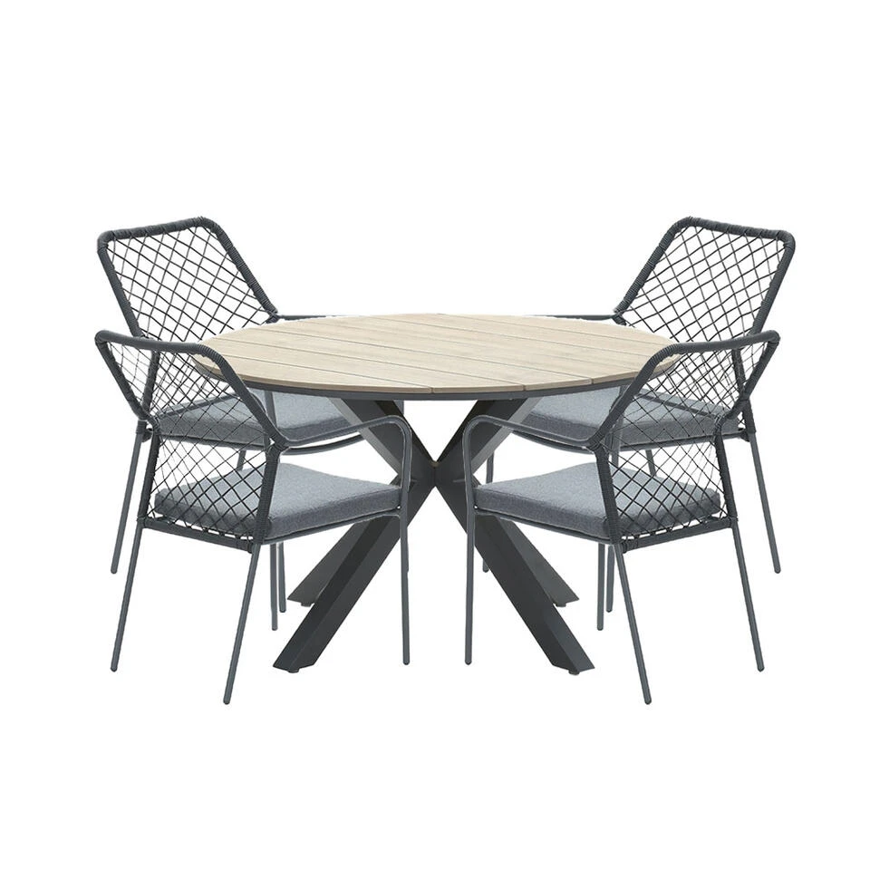 De Ross – Tulli 5-delige tuinset heeft een ruime ronde tuintafel met vier tuinstoelen. De tuinstoelen hebben een mooie afwerking van TPU draden. Dit geeft de stoel het uiterlijk of er touw is gebruikt. Bij de tuinstoelen worden zitkussens meegeleverd.