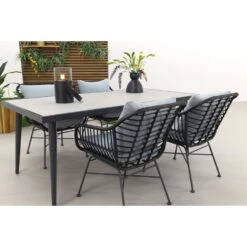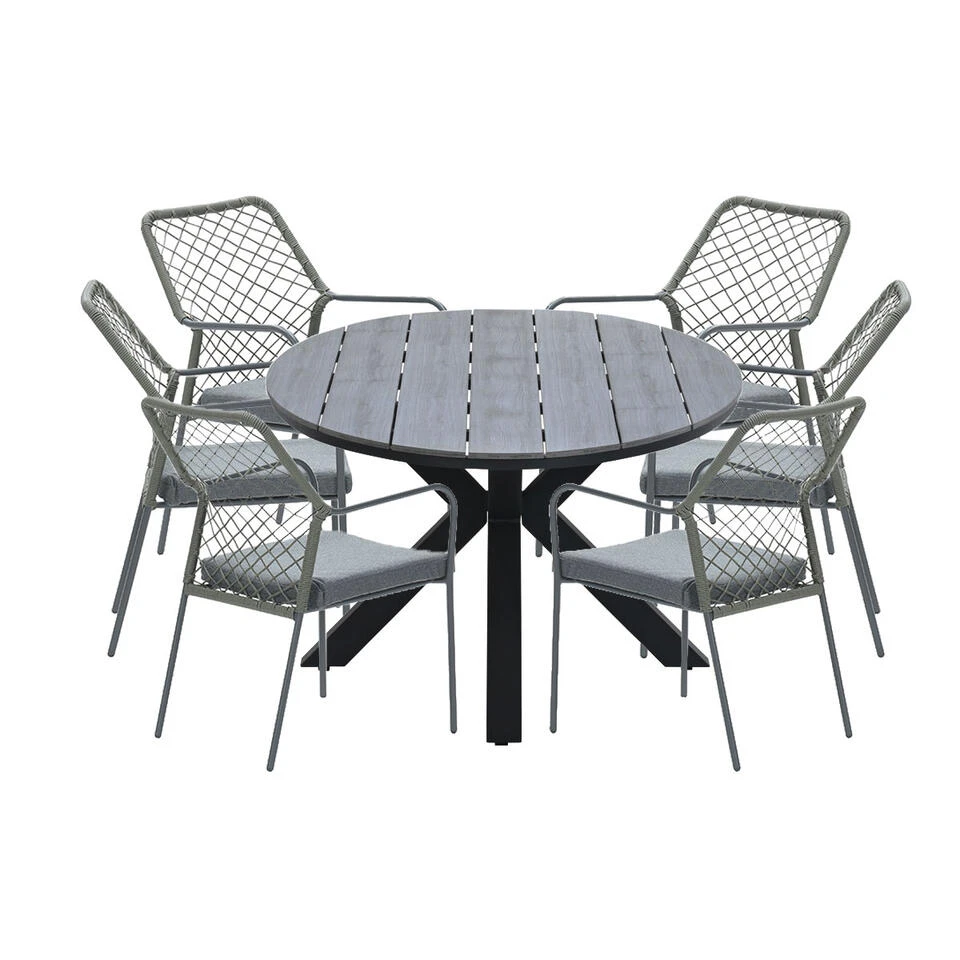 De Ross – Tulli 7-delige tuinset heeft een ruime ovale tuintafel met zes tuinstoelen. De tuinstoelen hebben een mooie afwerking van TPU draden. Dit geeft de stoel het uiterlijk of er touw is gebruikt. Bij de tuinstoelen worden zitkussens meegeleverd.