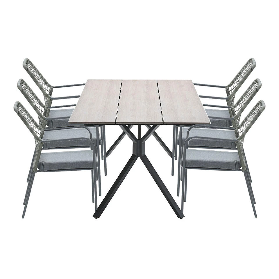 De Ross – Robin 7-delige tuinset heeft een ruime tuintafel met zes tuinstoelen. De tuinstoelen hebben een mooie afwerking van TPU draden. Dit geeft de stoel het uiterlijk of er touw is gebruikt. Bij de tuinstoelen worden zitkussens meegeleverd.