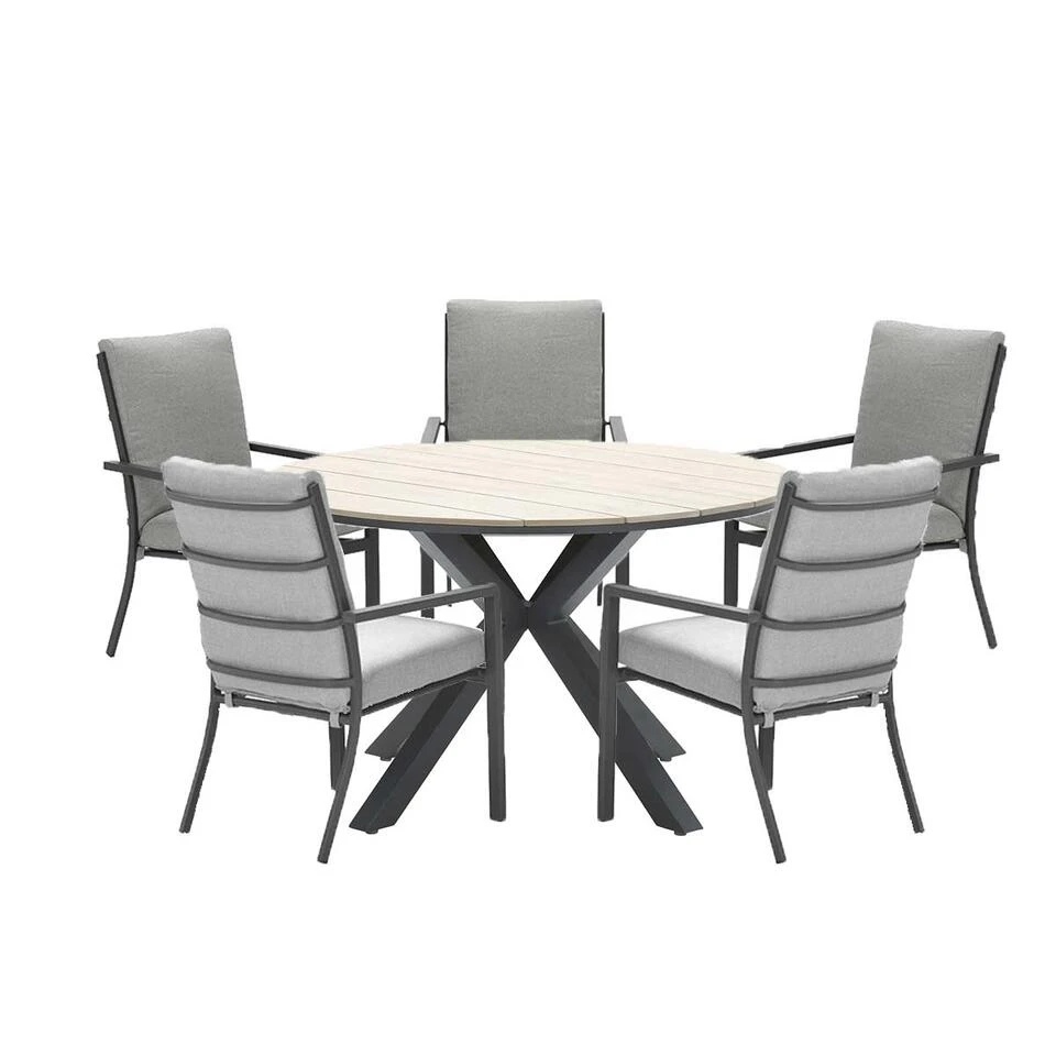 Een mooie ruime tuinset voor vijf personen gemaakt van hoogwaardige kwaliteit materialen. Deze tuinset heeft een mooie ronde tuintafel met strakke tuinstoelen en een comfortabele zit. De tuinstoelen en het frame van de tuintafel zijn gemaakt van aluminium. Het tafelblad van de tuintafel is gemaakt van polywood latten, dit is een onderhoudsvriendelijke kunststof met een mooie houtuitstraling. Na ontvangst dient het tafelframe nog bevestigd te worden aan het tafelblad. Dit is eenvoudig zelf te doen door de meegeleverde materialen. De tuintafel heeft een doorsnede van 148 cm en een hoogte van 75 cm. De afmeting van de tuinstoel zijn: 60 x 72,5 x 93 cm.